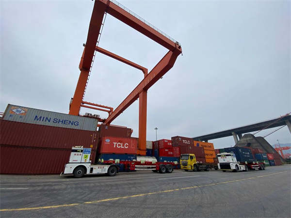 貨輪上五顏六色的集裝箱被岸橋穩穩“夾”起,堆場上擺滿貨物,秋冬時節的果園港依舊熱火朝天。指著遠程控制室巨大屏幕上的兩臺白色無人駕駛集裝箱卡車,劉煉說:“港口建設邁向智能化、綠色化,為果園港提升多式聯運物流效率、承擔更多開放功能,提供了堅實支撐。”