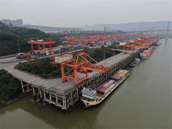 在重慶果園港碼頭停靠的貨輪。新華社記者 李愛斌 攝
