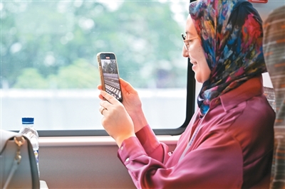 走進試乘的CR400BF-GS復興號智能提升動車組列車,26攝氏度,溫度宜人,窗外漸次閃過50余種不同類型的線橋隧試驗場景。整個體驗之旅,線路不長,風景不少,新鮮感十足。30分鐘的試乘時間里,高鐵列車急速駛過中國鐵道博物館(東郊展館)、北京朝陽動車運用所,穿行隧道、滑入彎道,在直線行駛時不斷加速,乘坐平穩舒適,車廂內中外嘉賓一起感受到了中國高鐵的先進技術和卓越性能,車廂外,沿途的參觀者們紛紛拿起手機拍照記錄。“這就是中國高鐵,創新、高效、便捷!”在現場參與體驗的英國博主亞當(Adam)感嘆。